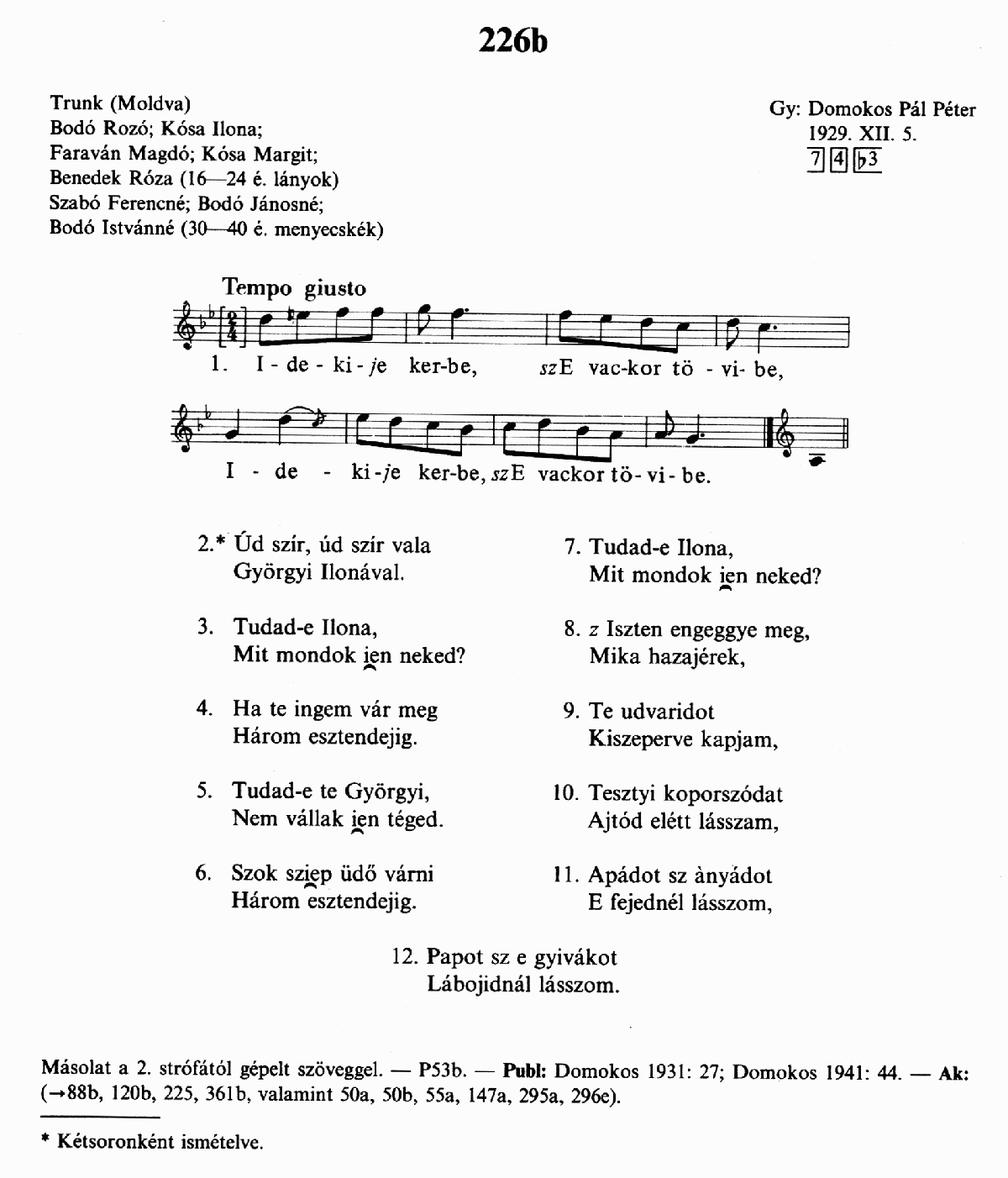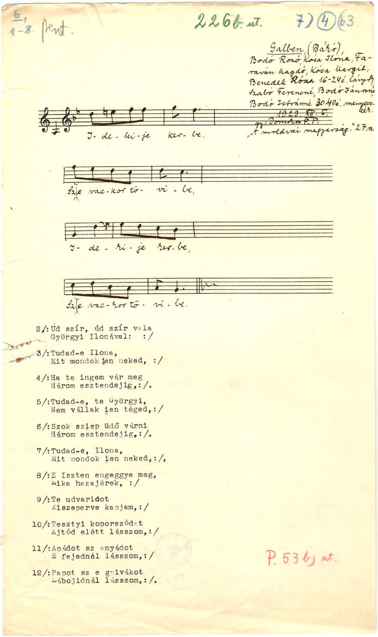 Informant: Bodó Róza (16-24), Kósa Ilona (16-24), Faraván Magdó (16-24), Kósa Margit (16-24), Benedek Róza (16-24), Szabó Ferencné (30-40), Bodó Jánosné (30-40), Bodó Istvánné (30-40)